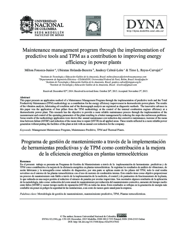 Keywords: Management Maintenance Program, Maintenance Preditive, TPM and Thermal Plants.