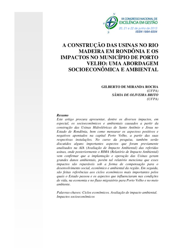 Este artigo procura apresentar, dentre os diversos impactos, em especial, os socioeconômicos e ambientais causados a partir da construção das Usinas Hidrelétricas de Santo Antônio e Jirau no Estado de Rondônia, bem como mensurar os aspectoss positivos e negativos apontados na capital Porto Velho, a partir das suas respectivas instalações. No curso da pesquisa, também serão discutidos alguns importantes aspectos que foram previamente analisados na AIA (Avaliação de Impacto Ambiental) das referidas usinas, onde posteriormente o RIMA (Relatório de Impacto Ambiental) vem confirmar que a implantação e operação das Usinas geram grandes danos ambientais, porém tal relatório menciona que esses impactos são reparáveis sob a forma de compensação para o desenvolvimento social, econômico e ambiental da região. Em seguida, são feitas referências aos ciclos econômicos mais importantes pelos quais o Estado passou e os aspectos que influenciaram nas condições de vida, na economia e no fluxo migratório para Porto Velho e no meio ambiente.