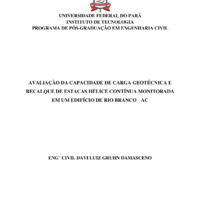 Nesta dissertação, avalia-se a capacidade de carga geotécnica e recalque das estacas tipo Hélice Contínua monitorada da obra da Superintendência Regional de Polícia Federal (DPF/AC), na Cidade de Rio Branco no Estado do Acre. A edificação consiste em três blocos distintos, divididos por duas juntas de dilatação, e é composta por um subsolo, quatro pavimentos, casa de máquinas e heliponto. As fundações são do tipo superficiais (Sapata Isolada) e profundas (estaca Hélice Contínua monitorada), sendo que as primeiras não foram analisadas por não se constituírem em objeto de estudo do presente trabalho.