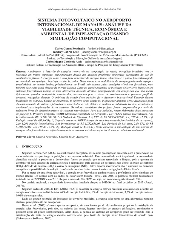 Atualmente, a inserção de energias renováveis na composição da matriz energética brasileira tem se mostrado em franca expansão, principalmente devido aos diversos problemas ambientais decorrentes do uso de combustíveis fósseis. A energia solar é uma fonte renovável de energia, limpa, silenciosa e o painel fotovoltaico pode ser instalado em qualquer local que receba luz solar. Deste modo, esta modalidade de energia ganha mais espaço e popularidade no mundo inteiro, principalmente no Brasil, não apenas pelas condições climáticas favoráveis, mas também pelo custo atual elevado da energia elétrica. Dado ao grande potencial de insolação do território brasileiro, os sistemas fotovoltaicos tornam-se uma alternativa bastante atrativa principalmente em aeroportos que são locais tipicamente grandes, horizontais, ensolarados, apresentam poucas áreas de sombreamento e possuem perfil de consumo energético elevado. O ambiente de estudo deste trabalho foi o Aeroporto Internacional Eduardo Gomes localizado em Manaus, Estado do Amazonas. O objetivo desse estudo foi inspecionar algumas áreas adequadas para dimensionamento de sistemas fotovoltaicos conectados à rede elétrica e analisar a viabilidade técnica, econômica e ambiental para implantação desses sistemas. Os valores numéricos dos projetos foram comprovados por meio de softwares livres de dimensionamento de sistemas fotovoltaicos. Para este trabalho, foram elaboradas duas propostas de projeto: 1) Primeira proposta: 4,6MW (demanda contratada do Aeroporto), 1.a) 14.832 painéis fotovoltaicos, 1.b) Investimento de R$ 19.500.000,00, 1.c) Payback de 8,6 anos, 1.d) VPL de R$ 60.906.929,00, 1.e) TIR de 12,5%, 1.f) Redução anual de 495,1tCO2; ii) Segunda proposta: 402kW (carga do estacionamento de funcionários do aeroporto), 2.a) 1.296 painéis fotovoltaicos, 2.b) Investimento de R$ 1.732.636,00, 2.c) Payback de 8,8 anos, 2.d) VPL de R$ 5.310.732,00, 2.e) TIR de 12,3%, 2.f) Redução anual de 43,4tCO2. Neste contexto, a implantação de um sistema de energia solar fotovoltaica no referido aeroporto mostrou-se viável nos aspectos técnico, econômico e ambiental.