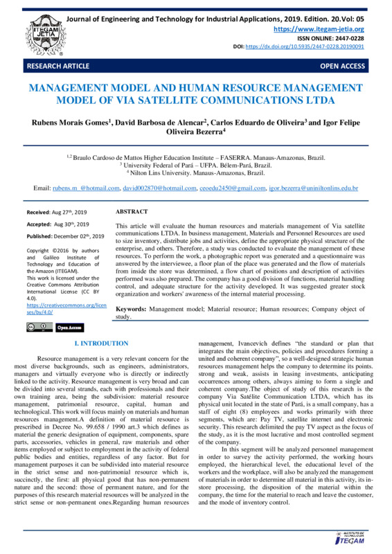 MANAGEMENT MODEL AND HUMAN RESOURCE MANAGEMENT MODEL OF VIA SATELLITE COMMUNICATIONS LTDA