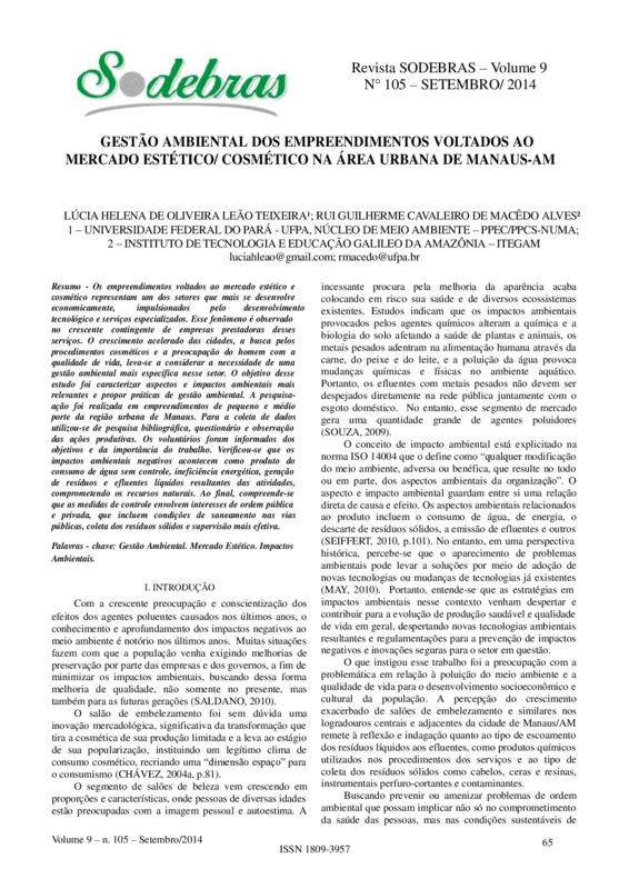 Os empreendimentos voltados ao mercado estético e cosmético representam um dos setores que mais se desenvolve economicamente, impulsionados pelo desenvolvimento tecnológico e serviços especializados. Esse fenômeno é observado no crescente contingente de empresas prestadoras desses serviços. O crescimento acelerado das cidades, a busca pelos procedimentos cosméticos e a preocupação do homem com a qualidade de vida, leva-se a considerar a necessidade de uma gestão ambiental mais específica nesse setor. O objetivo desse estudo foi caracterizar aspectos e impactos ambientais mais relevantes e propor práticas de gestão ambiental. A pesquisaação foi realizada em empreendimentos de pequeno e médio porte da região urbana de Manaus. Para a coleta de dados utilizou-se de pesquisa bibliográfica, questionário e observação das ações produtivas. Os voluntários foram informados dos objetivos e da importância do trabalho. Verificou-se que os impactos ambientais negativos acontecem como produto do consumo de água sem controle, ineficiência energética, geração de resíduos e efluentes líquidos resultantes das atividades, comprometendo os recursos naturais. Ao final, compreende-se que as medidas de controle envolvem interesses de ordem pública e privada, que incluem condições de saneamento nas vias públicas, coleta dos resíduos sólidos e supervisão mais efetiva.