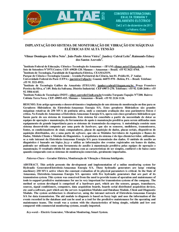 Este artigo apresenta o desenvolvimento e implantação de um sistema de monitoração on-line para os Geradores Hidráulicos da Eletrobrás-Amazonas Energia S/A. Estes geradores Hidráulicos são grandes máquinas rotativas de 250 MVA de potência ativa, onde a constante avaliação dos seus parâmetros físicos é crítica. No Estado do Amazonas a Eletrobrás-Amazonas Energia S/A, opera com cinco geradores hidráulicos que fazem parte do seu sistema de transmissão. Este sistema foi concebido a partir da necessidade de dotar as equipes de operação e manutenção, de ferramentas de apoio à manutenção preditiva para serem utilizadas num equipamento de grande importância para os sistemas de transmissão da empresa. A metodologia onsiste num sistema desenvolvido composto por uma parte de hardware, que são os sensores, medidores, transmissores, fontes, os condicionadores de sinal, computadores, placas de aquisição de dados, placas seriais, dispositivos de aquisição distribuídos, etc; e uma parte de software, que são os Módulos Servidores de Aquisição e Banco de Dados, Módulo Cliente e Módulo de Diagnóstico. A arquitetura do sistema é do tipo cliente/servidor, utilizandose a rede intranet da Eletrobrás-Amazonas Energia S/A para transmissão dos dados. O módulo de auxilio ao diagnóstico é baseado em lógica fuzzy e utiliza as informações dos eventos registrados em banco de dados, podendo ser utilizado como uma ferramenta de auxílio à manutenção preditiva pelas equipes de operação e manutenção. O resultado obtido foi um sistema com as características de ser simples, confiável e de baixo custo quando comparado com os sistemas de monitoração comerciais, geralmente importados.