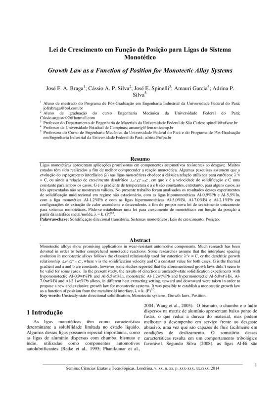 Ligas monotéticas apresentam aplicações promissoras em componentes automotivos resistentes ao desgaste. Muitos estudos têm sido realizados a fim de melhor compreender a reação monotética. Algumas pesquisas assumem que a evolução do espaçamento interfásico (λ) nas ligas monotéticas obedece à clássica relação utilizada para eutéticos: λ2v = C, ou ainda a relação de crescimento dendrítico . . a b ? v G ?C , em que v é a velocidade de solidificação e C uma constante para ambos os casos, G é o gradiente de temperatura e a e b são constantes, entretanto, para alguns casos, as leis apresentadas não se mostraram válidas. No presente trabalho foram analisados os resultados desses experimentos de solidificação unidirecional em regime não estacionário, com as ligas hipomonotéticas Al-0,9%Pb e Al-5,5%In, com a liga monotética Al-1,2%Pb e com as ligas hipermonotéticas Al-5,0%Bi, Al-7,0%Bi e Al-2,1%Pb em configurações de extração de calor ascendente e descendente, a fim de propor nova lei de crescimento unicamente para sistemas monotéticos. Pôde-se estabelecer uma lei para crescimento de monotéticos em função da posição a partir da interface metal/molde, λ = k. (P)0,5.