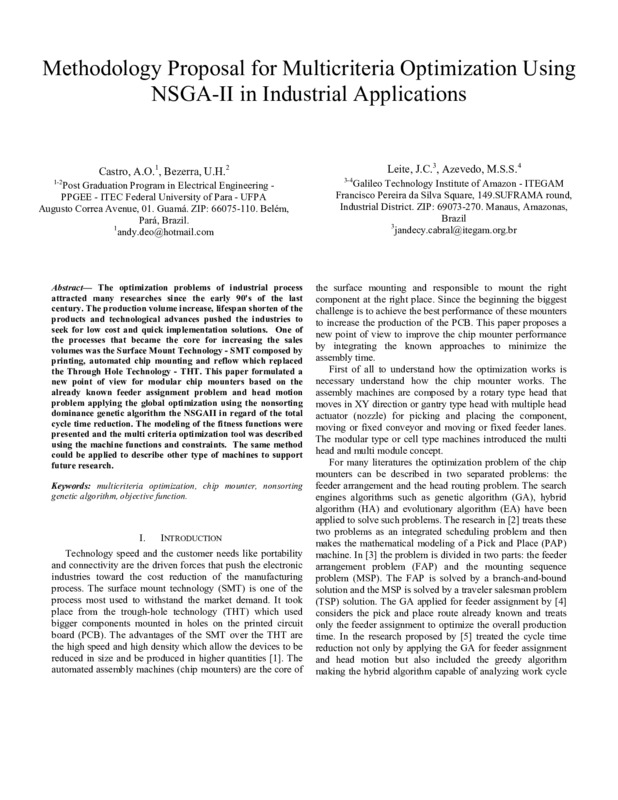 The optimization problems of industrial process attracted many researches since the early 90's of the last century. The production volume increase, lifespan shorten of the products and technological advances pushed the industries to seek for low cost and quick implementation solutions. One of the processes that became the core for increasing the sales volumes was the Surface Mount Technology - SMT composed by printing, automated chip mounting and reflow which replaced the Through Hole Technology - THT. This paper formulated a new point of view for modular chip mounters based on the already known feeder assignment problem and head motion problem applying the global optimization using the nonsorting dominance genetic algorithm the NSGAII in regard of the total cycle time reduction. The modeling of the fitness functions were presented and the multi criteria optimization tool was described using the machine functions and constraints. The same method could be applied to describe other type of machines to support future research.
