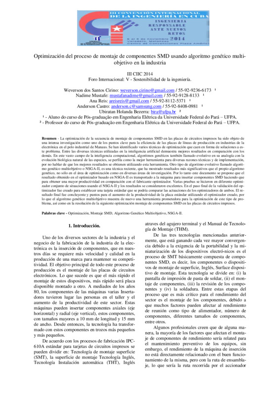 La optimización de la secuencia de montaje de componentes SMD en las placas de circuitos impresos ha sido objeto de una intensa investigación como uno de los puntos clave para la eficiencia de las placas de líneas de producción en industrias de la electrónica en el polo industrial de Manaus. Se han identificado varios técnicas de optimización que caen en forma de soluciones a es-te problema. Entre las diversas técnicas utilizadas en la inteligencia artificial demuestra mejores resultados en comparación con los demás. En este vasto campo de la inteligencia computacional, algoritmos genéticos también llamado evolutivo en su analogía con la evolución biológica natural de las especies, se perfila como la mejor herramienta para diversas razones técnicas y de implementación, por no hablar de que los mejores resultados se obtienen utilizando esta herramienta. Otro tipo de algoritmo evolutivo llamado algorit-mo genético multiobjetivo o NSGA-II, es una técnica reciente, que ha mostrado resultados más significativos que el propio algoritmo genético, no sólo en el área de optimización como en diversas áreas de investigación. Por lo tanto este documento se propone que el resultado obtenido en el optimizador basado en NSGA-II es transportado a la máquina para insertar componentes SMD haciendo que para obtener una mayor productividad en comparación con el fabricante optimizador. Varias pruebas se hicieron en diferente optimi-zador conjunto de situaciones usando el NSGA-II y los resultados se consideraron excelentes. En el paso final de la validación del op-timizador fue creado para establecer una tarjeta estándar que se podría comparar las actuaciones de los optimizadores de ambos. El re-sultado final fue concluyente y puntos para el aumento de la productividad de la placa estándar utilizando el optimizador creado, por lo que el algoritmo genético multiobjetivo muestra de nuevo una herramienta prometedora para la optimización de este tipo de pro-blema, así como en la resolución de la siguiente optimización montaje de componentes SMD en las placas de circuitos impresos.