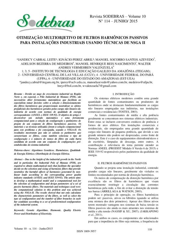 Devido ao auge do crescimento industrial na Região Norte e, em especial, o Pólo Industrial de Manaus (PIM), são necessários obter ferramentas matemáticas que facilitem ao especialista tomar decisões sobre a seleção e dimensionamento dos filtros harmônicos que proporcionam neutralizar os efeitos prejudiciais dos harmônicos gerados pelas cargas não lineares da indústria de acordo com normas de qualidade de energia correspondentes (ANEEL e IEEE 519-92). O objetivo de artigo é desenvolver um método matemático e uma ferramenta computacional para a seleção da configuração e parâmetros de projeto de um conjunto de filtros harmônicos passivos. Os materiais e as técnicas utilizadas foram à solução computacional para este problema e foi conseguida, usando o NSGA-II. Os resultados mostraram que não só calcula os parâmetros que caracterizam os filtros, como também seleciona o tipo de configuração e o número de ramos do filtro em cada barra candidata de acordo com um conjunto de configurações pré-estabelecidas do sistema industrial.