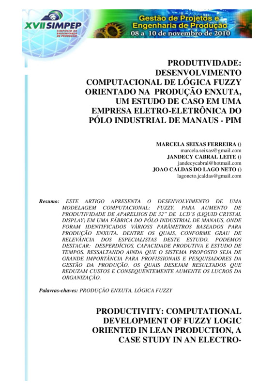 PRODUTIVIDADE: DESENVOLVIMENTO COMPUTACIONAL DE LÓGICA FUZZY ORIENTADO NA PRODUÇÃO ENXUTA, UM ESTUDO DE CASO EM UMA EMPRESA ELETRO-ELETRÔNICA DO PÓLO INDUSTRIAL DE MANAUS - PIM