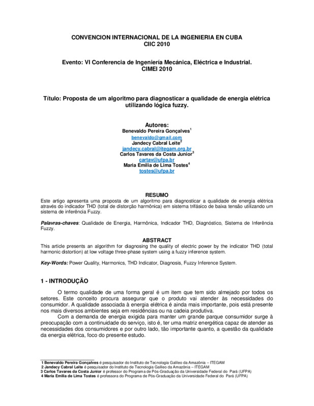 Este artigo apresenta uma proposta de um algoritmo para diagnosticar a qualidade de energia elétrica através do indicador THD (total de distorção harmônica) em sistema trifásico de baixa tensão utilizando um sistema de inferência Fuzzy.