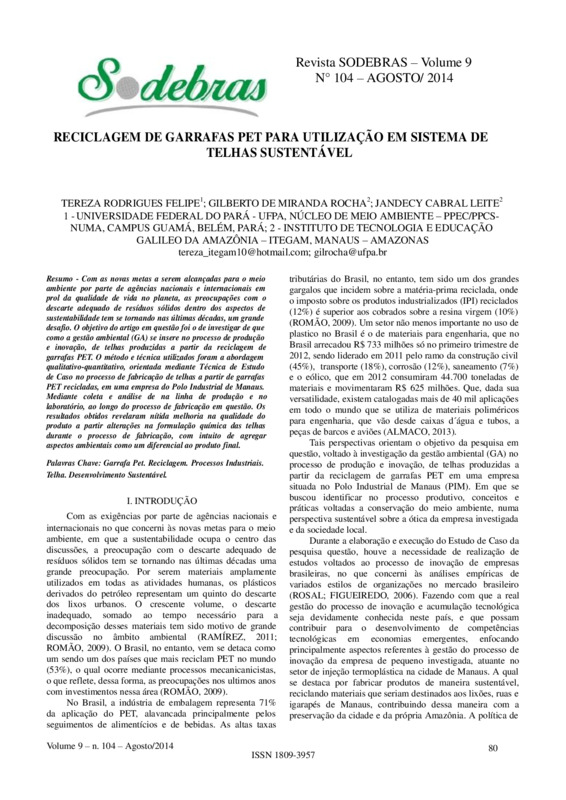 Com as novas metas a serem alcançadas para o meio ambiente por parte de agências nacionais e internacionais em prol da qualidade de vida no planeta, as preocupações com o descarte adequado de resíduos sólidos dentro dos aspectos de sustentabilidade tem se tornando nas últimas décadas, um grande desafio. O objetivo do artigo em questão foi o de investigar de que como a gestão ambiental (GA) se insere no processo de produção e inovação, de telhas produzidas a partir da reciclagem de garrafas PET. O método e técnica utilizados foram a abordagem qualitativo-quantitativo, orientada mediante Técnica de Estudo de Caso no processo de fabricação de telhas a partir de garrafas PET recicladas, em uma empresa do Polo Industrial de Manaus. Mediante coleta e análise de na linha de produção e no laboratório, ao longo do processo de fabricação em questão. Os resultados obtidos revelaram nítida melhoria na qualidade do produto a partir alterações na formulação química das telhas durante o processo de fabricação, com intuito de agregar aspectos ambientais como um diferencial ao produto final.