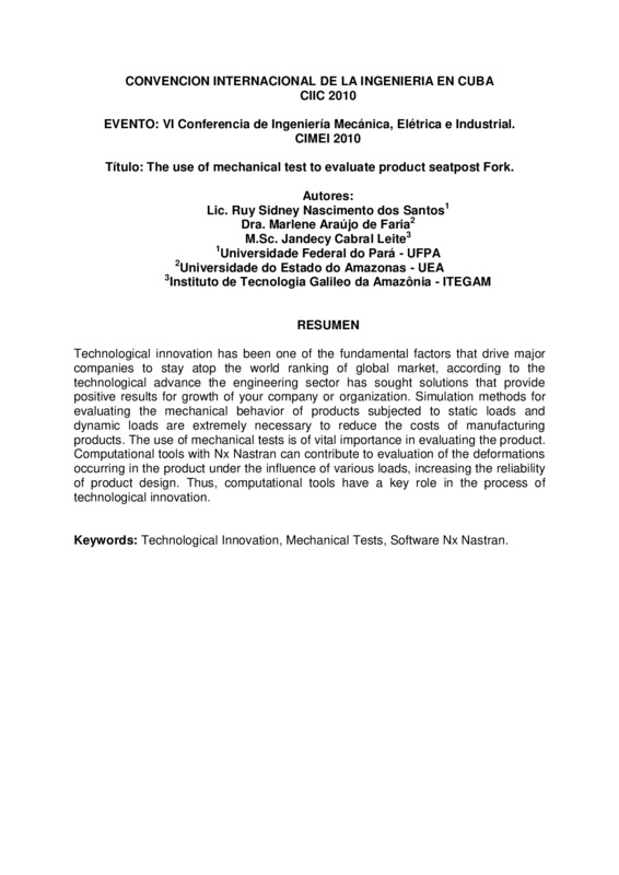 Technological innovation has been one of the fundamental factors that drive major companies to stay atop the world ranking of global market, according to the technological advance the engineering sector has sought solutions that provide positive results for growth of your company or organization. Simulation methods for evaluating the mechanical behavior of products subjected to static loads and dynamic loads are extremely necessary to reduce the costs of manufacturing products. The use of mechanical tests is of vital importance in evaluating the product. Computational tools with Nx Nastran can contribute to evaluation of the deformations occurring in the product under the influence of various loads, increasing the reliability of product design. Thus, computational tools have a key role in the process of technological innovation.