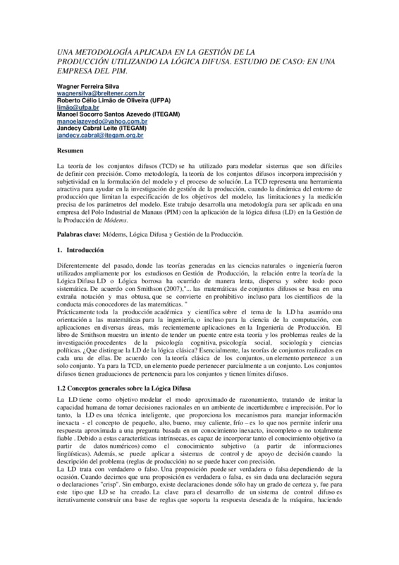 La teoría de los conjuntos difusos (TCD) se ha utilizado para modelar sistemas que son difíciles de definir con precisión. Como metodología, la teoría de los conjuntos difusos incorpora imprecisión y subjetividad en la formulación del modelo y el proceso de solución. La TCD representa una herramienta atractiva para ayudar en la investigación de gestión de la producción, cuando la dinámica del entorno de producción que limitan la especificación de los objetivos del modelo, las limitaciones y la medición precisa de los parámetros del modelo. Este trabajo desarrolla una metodología para ser aplicada en una empresa del Polo Industrial de Manaus (PIM) con la aplicación de la lógica difusa (LD) en la Gestión de la Producción de Módems.