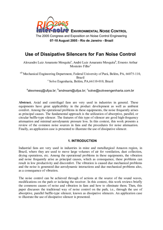 Axial and centrifugal fans are very used in industries in general. These equipments have great applicability in the product development as well as ambient comfort. Among the operational problems in these equipments, the noise frequently arises as principal causes. The fundamental approach is the utilization of absorptive, parallel, or circular baffle-type silencer. The features of this type of silencer are good high-frequency attenuation and minimal aerodynamic pressure loss. In this context, this work presents a review of the common noise sources in fans and the procedures for noise attenuation. Finally, an application case is presented to illustrate the use of dissipative silencer.