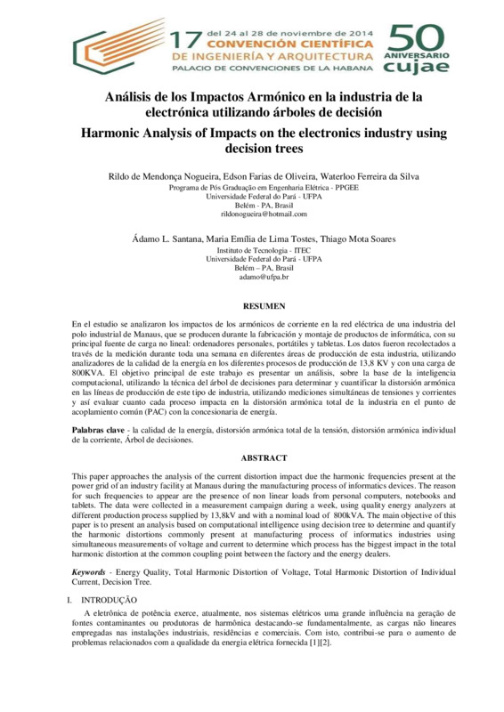 En el estudio se analizaron los impactos de los armónicos de corriente en la red eléctrica de una industria del polo industrial de Manaus, que se producen durante la fabricación y montaje de productos de informática, con su principal fuente de carga no lineal: ordenadores personales, portátiles y tabletas. Los datos fueron recolectados a través de la medición durante toda una semana en diferentes áreas de producción de esta industria, utilizando analizadores de la calidad de la energía en los diferentes procesos de producción de 13,8 KV y con una carga de 800KVA. El objetivo principal de este trabajo es presentar un análisis, sobre la base de la inteligencia computacional, utilizando la técnica del árbol de decisiones para determinar y cuantificar la distorsión armónica en las líneas de producción de este tipo de industria, utilizando mediciones simultáneas de tensiones y corrientes y así evaluar cuanto cada proceso impacta en la distorsión armónica total de la industria en el punto de acoplamiento común (PAC) con la concesionaria de energía.