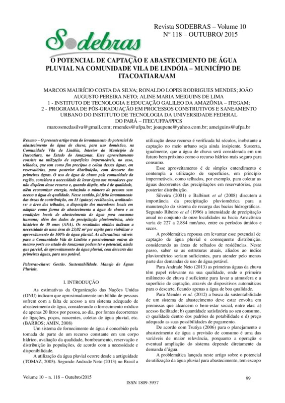 O Potencial de captação e abastecimento de água Pluvial na comunidade vila de Lindóia–Município de Itacoatiara/Am