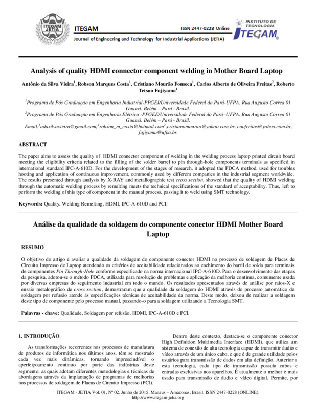 O objetivo do artigo é avaliar a qualidade da soldagem do componente conector HDMI no processo de soldagem de Placas de Circuito Impresso de Laptop atendendo os critérios de aceitabilidade relacionados ao enchimento do barril de solda para terminais de componentes Pin Through-Hole conforme especificado na norma internacional IPC-A-610D. Para o desenvolvimento das etapas da pesquisa, adotou-se o método PDCA, utilizada para resolução de problemas e aplicação da melhoria contínua, comumente usada por diversas empresas do seguimento industrial em todo o mundo. Os resultados apresentados através de análise por raios-X e ensaio metalográfico de cross section, demostraram que a qualidade da soldagem do HDMI através do processo automático de soldagem por refusão atende ás especificações técnicas de aceitabilidade da norma. Deste modo, deixou de realizar a soldagem deste tipo de componente pelo processo manual, passando-o para a soldagem utilizando a Tecnologia SMT.