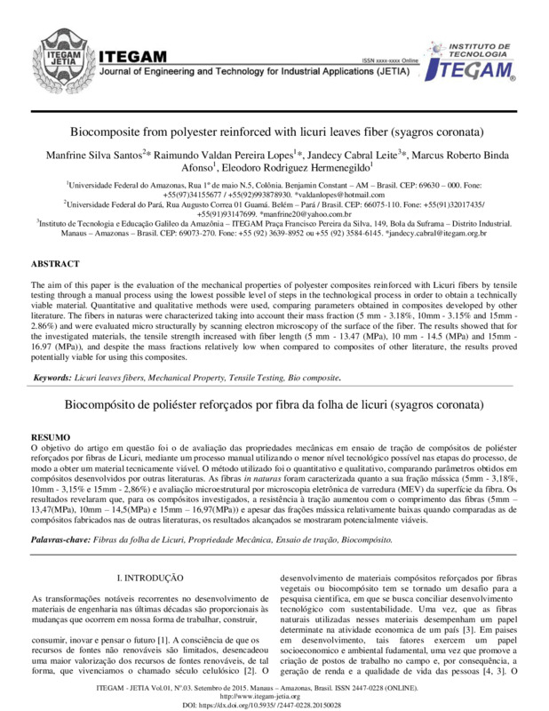 O objetivo do artigo em questão foi o de avaliação das propriedades mecânicas em ensaio de tração de compósitos de poliéster reforçados por fibras de Licuri, mediante um processo manual utilizando o menor nível tecnológico possível nas etapas do processo, de modo a obter um material tecnicamente viável. O método utilizado foi o quantitativo e qualitativo, comparando parâmetros obtidos em compósitos desenvolvidos por outras literaturas. As fibras in naturas foram caracterizada quanto a sua fração mássica (5mm - 3,18%, 10mm - 3,15% e 15mm - 2,86%) e avaliação microestrutural por microscopia eletrônica de varredura (MEV) da superfície da fibra. Os resultados revelaram que, para os compósitos investigados, a resistência à tração aumentou com o comprimento das fibras (5mm – 13,47(MPa), 10mm – 14,5(MPa) e 15mm – 16,97(MPa)) e apesar das frações mássica relativamente baixas quando comparadas as de compósitos fabricados nas de outras literaturas, os resultados alcançados se mostraram potencialmente viáveis.