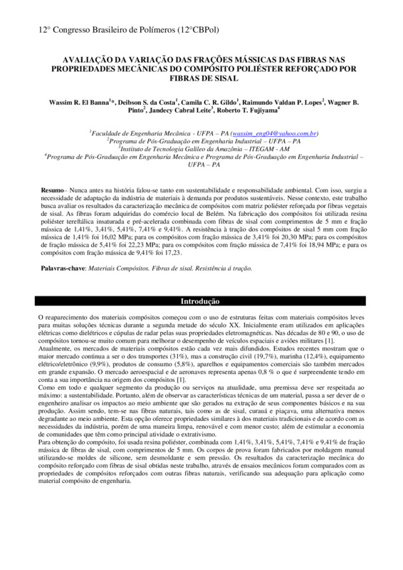Avaliacao da variacao das fracoes méssicas das fibras nas propriedades mecanicas do composito poliester reforcado por fibras de sisal