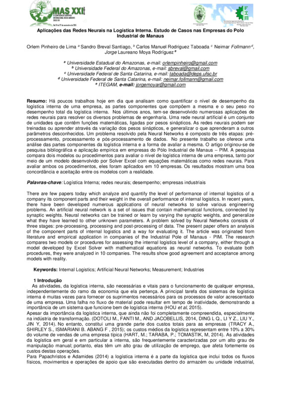 Palavras-chave: Logística Interna; redes neurais; desempenho; empresas industriais