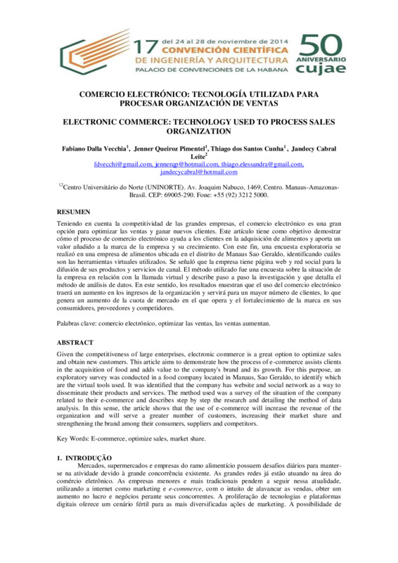 Teniendo en cuenta la competitividad de las grandes empresas, el comercio electrónico es una gran opción para optimizar las ventas y ganar nuevos clientes. Este artículo tiene como objetivo demostrar cómo el proceso de comercio electrónico ayuda a los clientes en la adquisición de alimentos y aporta um valor añadido a la marca de la empresa y su crecimiento. Con este fin, una encuesta exploratoria se realizó en una empresa de alimentos ubicada en el distrito de Manaus Sao Geraldo, identificando caules son las herramientas virtuales utilizados. Se señaló que la empresa tiene página web y red social para la difusión de sus productos y servicios de canal. El método utilizado fue una encuesta sobre la situación de la empresa en relación con la llamada virtual y describe paso a paso la investigación y que detalla el método de análisis de datos. En este sentido, los resultados muestran que el uso del comercio electrónico traerá un aumento en los ingresos de la organización y servirá para un mayor número de clientes, lo que genera un aumento de la cuota de mercado en el que opera y el fortalecimiento de la marca en sus consumidores, proveedores y competidores.