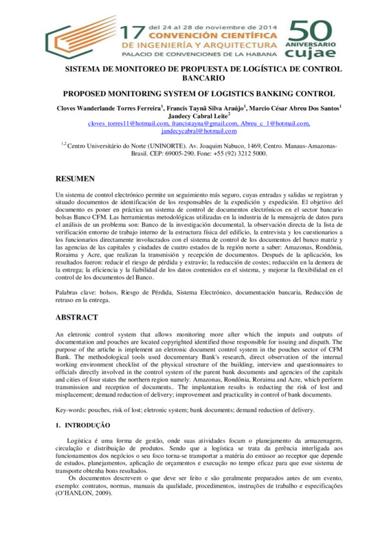 Un sistema de control electrónico permite un seguimiento más seguro, cuyas entradas y salidas se registran y situado documentos de identificación de los responsables de la expedición y expedición. El objetivo del documento es poner en práctica un sistema de control de documentos electrónicos en el sector bancario bolsas Banco CFM. Las herramientas metodológicas utilizadas en la industria de la mensajería de datos para el análisis de un problema son: Banco de la investigación documental, la observación directa de la lista de verificación entorno de trabajo interno de la estructura física del edificio, la entrevista y los cuestionarios a los funcionarios directamente involucrados con el sistema de control de los documentos del banco matriz y las agencias de las capitales y ciudades de cuatro estados de la región norte a saber: Amazonas, Rondônia, Roraima y Acre, que realizan la transmisión y recepción de documentos. Después de la aplicación, los resultados fueron: reducir el riesgo de pérdida y extravío; la reducción de costes; reducción en la demora de la entrega; la eficiencia y la fiabilidad de los datos contenidos en el sistema, y mejorar la flexibilidad en el control de los documentos del Banco.
