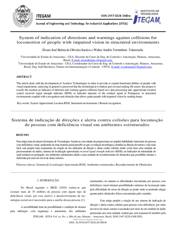 Sistema de indicação de direções e alerta contra colisões para locomoção de pessoas com deficiência visual em ambientes estruturados