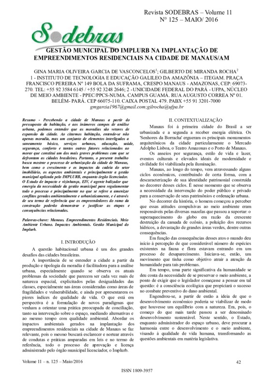Palavras-chave: Manaus. Empreendimentos Residenciais. Meio Ambiente Urbano. Impactos Ambientais. Gestão Municipal do Implurb.