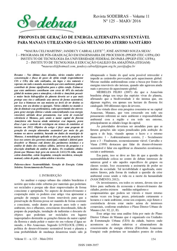 Nas últimas duas décadas, vários estudos sobre a concentração e fluxo de gases de efeito estufa (especialmente CO2 e CH4) têm sido realizados, em lagos e rios naturais e represas em todo o mundo, mostrando que estes ambientes podem contribuir de forma significativa para o efeito estufa. Estima-se que estes ambientes contribuem com cerca de 40% da emissão global de metano para a atmosfera, e devido a Amazônia possuir a maior bacia hidrográfica do planeta deveria ser a que mais protege seus rios e utilizando seus aterros de forma sustentável, por isso a biomassa em sua maioria ao invés de ter destino os aterros, tem seu destino os igarapés. Várias cidades no mundo a fim de diminuir essa problemática, estão aproveitando dos aterros para gerar energia elétrica e ainda comercializando essa energia renovável, advindo desse pensamento, isso seria de essencial relevância à Manaus, pois sendo a maior capital da floresta Amazônica não buscou ainda minimizar esse impacto, prova disso é que o controle de reciclagem em termos de estatística só iniciou em 2012. Objetivo do artigo é fazer uma proposta de geração de energia alternativa sustentável por meio do gás metano no aterro sanitário, baseada em dados do município de Manaus. A metodologia aplicada se deu por meio da pesquisa in loco nos setores dos governos municipal, estadual e federal para descobrir se Manaus está dentro dos parâmetros mínimos e a análise de dados dos resíduos sólidos, universo da pesquisa e a descrição detalhada da análise de dados. Os resultados obtidos foram que Manaus hoje gera em torno de 2.632,156 t/dia, sendo coleta domiciliar, coleta hospitalar, remoção mecânica, remoção manual, coleto de poda, coleta seletiva e terceiro.