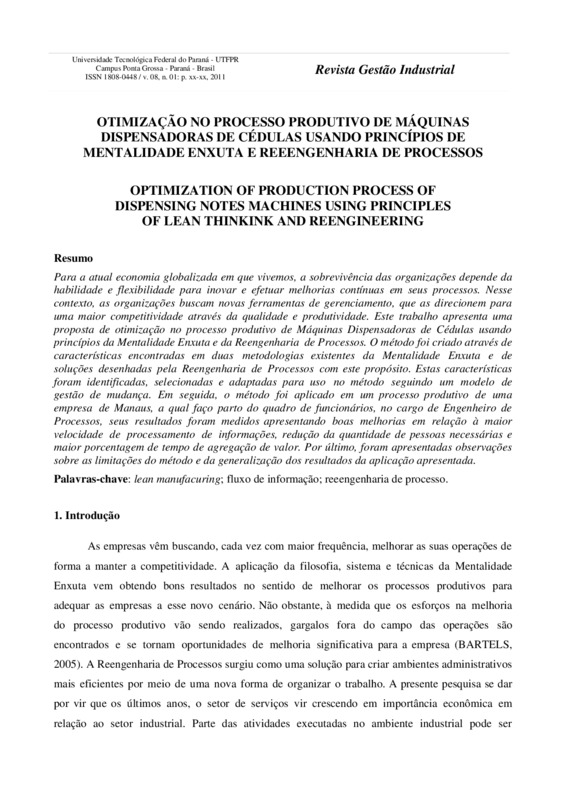 Para a atual economia globalizada em que vivemos, a sobrevivência das organizações depende da habilidade e flexibilidade para inovar e efetuar melhorias contínuas em seus processos. Nesse contexto, as organizações buscam novas ferramentas de gerenciamento, que as direcionem para uma maior competitividade através da qualidade e produtividade. Este trabalho apresenta uma proposta de otimização no processo produtivo de Máquinas Dispensadoras de Cédulas usando princípios da Mentalidade Enxuta e da Reengenharia de Processos. O método foi criado através de características encontradas em duas metodologias existentes da Mentalidade Enxuta e de soluções desenhadas pela Reengenharia de Processos com este propósito. Estas características foram identificadas, selecionadas e adaptadas para uso no método seguindo um modelo de gestão de mudança. Em seguida, o método foi aplicado em um processo produtivo de uma empresa de Manaus, a qual faço parto do quadro de funcionários, no cargo de Engenheiro de Processos, seus resultados foram medidos apresentando boas melhorias em relação à maior velocidade de processamento de informações, redução da quantidade de pessoas necessárias e maior porcentagem de tempo de agregação de valor. Por último, foram apresentadas observações sobre as limitações do método e da generalização dos resultados da aplicação apresentada.