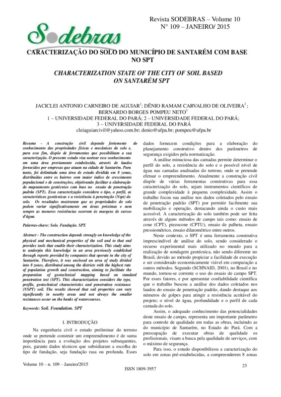 A construção civil depende fortemente doconhecimento das propriedades físicas e mecânicas do solo e,para esse fim, dispõe de ferramentas que possibilitam a suacaracterização. O presente estudo visa nortear esse conhecimentoem uma área previamente estabelecida, através de laudosfornecidos por empresas que atuam na cidade de Santarém. Paratanto, foi delimitada uma área de estudo dividida em 8 zonas,distribuídas entre os bairros com maior índice de crescimentopopulacional e de construções, objetivando facilitar a elaboraçãodo mapeamento geotécnico com base no ensaio de penetraçãopadrão (SPT). Essa caracterização considera o tipo, o perfil, ascaracterísticas geotécnicas e a resistência à penetração (Nspt) dosolo. Os resultados mostraram que as propriedades do solopodem variar significativamente em áreas próximas e nemsempre as menores resistências ocorrem às margens de cursosd’água.