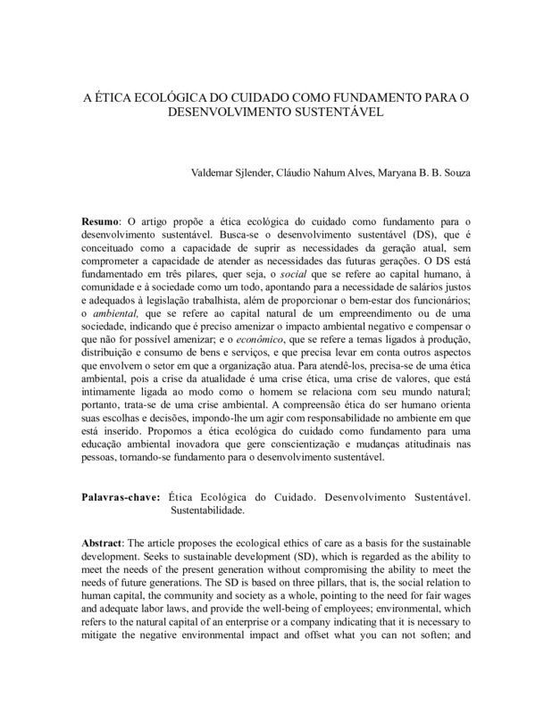 A ÉTICA ECOLÓGICA DO CUIDADO COMO FUNDAMENTO PARA O DESENVOLVIMENTO SUSTENTÁVEL