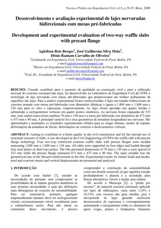 Visando contribuir para o aumento da qualidade na construção civil e para a utilização racional do concreto estrutural das lajes, foi desenvolvido no Laboratório de Engenharia Civil da UFPA a tecnologia de laje nervurada com mesas pré-fabricadas que proporcionam um melhor acabamento da superfície das lajes. Para a análise experimental foram confeccionadas 4 lajes nervuradas bidirecionais de concreto armado com mesas pré-fabricadas com dimensões idênticas e iguais a 1.800 mm x 1.800 mm x 150 mm para os vãos e espessuras, respectivamente. As lajes foram apoiadas nas quatro bordas e submetidas a carregamentos verticais em quatro pontos simétricos. As nervuras foram espaçadas de 533 mm, suas seções transversais mediam 70 mm x 150 mm e a mesa pré-fabricada com dimensões de 473 mm x 473 mm x 40 mm. A principal variável foi a taxa geométrica de armadura longitudinal nas nervuras. São apresentados e analisados os resultados experimentais obtidos para as cargas últimas, modos de ruptura, deformações da armadura de flexão, deformações no concreto e deslocamentos verticais.