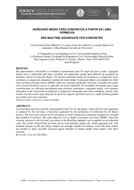 São apresentados e discutidos os resultados experimentais para 54 corpos de prova, onde o agregado miúdo areia é substituído pela lama vermelha, um subproduto gerado pela indústria de produção do alumínio, através do processo Bayer. Os ensaios realizados foram de resistência a compressão axial, resistência a compressão diametral e módulo de elasticidade. O principal objetivo do trabalho foi obter uma resistência de pelo menos 20MPa, onde esse concreto produzido com lama vermelha, de acordo com a norma brasileira, possa ser aplicado em escala industrial. Os resultados mostraram que a lama vermelha pode ser utilizada parcialmente para substituir totalmente o agregado miúdo, com mínimas alterações no ph, fornecendo resistências à compressão adequadas para obras ordinárias, porém, mais estudos são necessários para detecção de possíveis agentes químicos nocivos a saúde humana quando em contato com estes concretos.