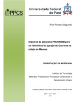 Impactos do programa PROSAMIM para os ribeirinhos do Igarapé do Quarenta na cidade de Manaus A proposta desta dissertação tem como objetivos: analisar impactos do programa PROSAMIM para os ribeirinhos do igarapé do quarenta na cidade de Manaus, demonstrando a importância da implantação do Programa para os moradores das margens do igarapé, e os objetivos específicos: identificar em literatura especifica a localização da cidade de Manaus; analisar os principais impactos ambientais ocorridos com a urbanização no ambiente dos ribeirinhos do Igarapé do Quarenta e destacar os principais benefícios ocorridos para os habitantes do Igarapé, depois da implantação do PROSAMIM. A pesquisa aborda a dinâmica social dos moradores da área de intervenção do programa e como os moradores percebem esta intervenção. A metodologia trata da compreensão da formação do espaço urbano, entendido como um produto social. Para o desenvolvimento desta pesquisa, partiu-se de uma metodologia de abordagem quali-quantitativa, com fundamentação de obras relacionadas com a temática levantada, tomando por método a análise bibliográfica, a pesquisa de campo, entrevistas, aplicação de formulários, registros fotográficos e observação participante de modo que o desenvolvimento da mesma contempla-se os objetivos propostos. É neste contexto que o processo de expansão urbana que Manaus ao longo desses anos vem incorporando em seus espaços, e as ocupações em áreas inundáveis marcam os espaços da cidade, havendo maior aglomeração nos igarapés situados nas proximidades do centro. A organização espacial é a própria expressão material do homem, onde no espaço são refletidas as características do grupo que o criou. Na sociedade classista, tais espaços são estratificados, assim sendo, a classe de baixa renda vai se organizar tanto no centro, constituindo espaços periféricos. -