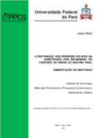 A DESTINAÇÃO DOS RESÍDUOS SÓLIDOS DA CONSTRUÇÃO CIVIL EM MANAUS: DO CANTEIRO DE OBRAS AO DESTINO FINAL O desenvolvimento de técnicas e métodos para a viabilização da sustentabilidade das atividades do dia-a-dia tem-se intensificado uma vez que a prática do reaproveitamento dos resíduos da construção civil é a tendência mundial para a mitigação dos problemas ambientais. O sistema de reaproveitamento é a técnica que vem sendo adotada pelas empresas da construção civil com objetivo de baixar o impacto ambiental, assim como a redução dos custos com a criação de outros novos produtos da mesma matéria prima o que vem garantir o sucesso de vendas dos produtos no mercado da construção civil. A realidade sobre o direcionamento dos resíduos da construção civil na cidade de Manaus ainda é muito preocupante não só na visão dos ambientalistas como da sociedade em geral, uma vez que as discussões sobre o Meio Ambiente vêm se crescendo e ainda pela necessidade da elaboração do Plano Municipal de Gestão de Resíduos de Construção Civil para a cidade de Manaus, previsto na Resolução Nº 307 do Conselho Nacional de Meio Ambiente (CONAMA). Para o aterro sanitário municipal são direcionados apenas os entulhos e/ou carliças, restos de barro, pedregulhos, restos de madeiras, restos de demolição, dentre outros agregados que não possuem reutilização. Outros materiais como: madeira, ferros, telhas galvanizadas/ amianto, restos de tubulações de água fria, esgoto, fiação elétrica, tijolos, cerâmicas, britas ou são reaproveitados nos próprios canteiros de obras ou são vendidos e/ou doados a empresas e/ou cooperativas para a condução do beneficiamento final. Como Manaus ainda não possui uma usina de reciclagem e beneficiamento, previsto pela Resolução do COMANA desde 2002 para estes resíduos, as empresas ficam a mercê da vontade alheia que facilmente podem conduzi-los para locais inapropriados ilegalmente. O alto custo do recebimento dos entulhos da construção no aterro municipal de Manaus, está incentivando a elaboração do Plano Gerencial dos Resíduos da Construção Civil – PGRCC pelas empresas construtoras, tanto no canteiro de obras como em sua sede administrativa, uma vez que maior parte destes materiais podem ser reutilizados nas próprias obras ou na produção de outros materiais com a mesma matéria prima. Desta maneira, é fundamental que este Plano estabelecido pela CONAMA e pelo Plano Municipal de Resíduos Sólidos de Manaus seja efetivado, para que a prática do reuso, beneficiamento, reciclagem sejam colocados em prática, para então haver redução dos impactos causados no meio ambiente e consequentemente redução de custos. Palavras chave: meio ambiente – resíduos sólidos – resíduos da construção civil - reciclagem -