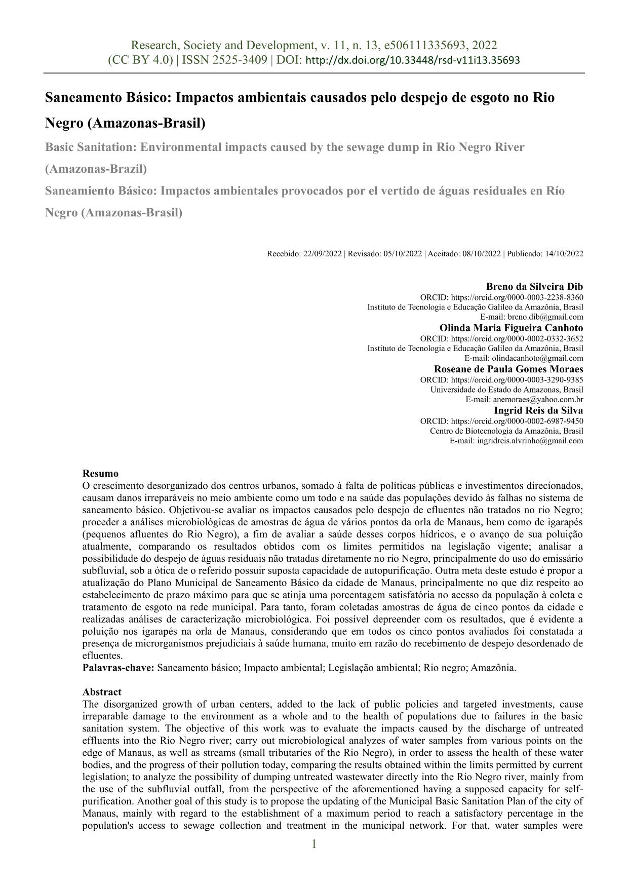 Basic Sanitation: Environmental impacts caused by the sewage dump in Rio Negro River (Amazonas-Brazil) O crescimento desorganizado dos centros urbanos, somado à falta de políticas públicas e investimentos direcionados, causam danos irreparáveis no meio ambiente como um todo e na saúde das populações devido às falhas no sistema de saneamento básico. Objetivou-se avaliar os impactos causados pelo despejo de efluentes não tratados no rio Negro; proceder a análises microbiológicas de amostras de água de vários pontos da orla de Manaus, bem como de igarapés (pequenos afluentes do Rio Negro), a fim de avaliar a saúde desses corpos hídricos, e o avanço de sua poluição atualmente, comparando os resultados obtidos com os limites permitidos na legislação vigente; analisar a possibilidade do despejo de águas residuais não tratadas diretamente no rio Negro, principalmente do uso do emissário subfluvial, sob a ótica de o referido possuir suposta capacidade de autopurificação. Outra meta deste estudo é propor a atualização do Plano Municipal de Saneamento Básico da cidade de Manaus, principalmente no que diz respeito ao estabelecimento de prazo máximo para que se atinja uma porcentagem satisfatória no acesso da população à coleta e tratamento de esgoto na rede municipal. Para tanto, foram coletadas amostras de água de cinco pontos da cidade e realizadas análises de caracterização microbiológica. Foi possível depreender com os resultados, que é evidente a poluição nos igarapés na orla de Manaus, considerando que em todos os cinco pontos avaliados foi constatada a presença de microrganismos prejudiciais à saúde humana, muito em razão do recebimento de despejo desordenado de efluentes.