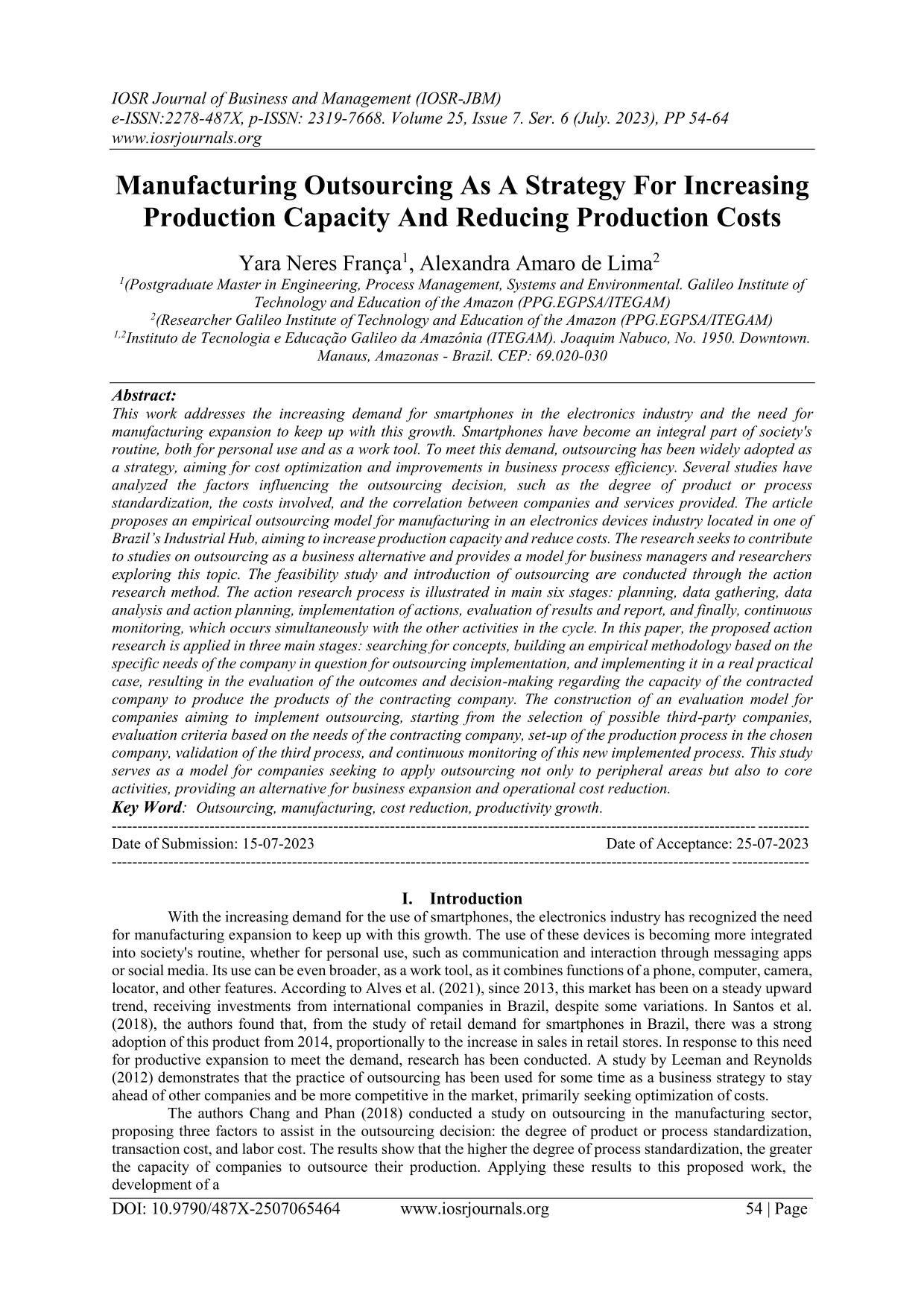 Manufacturing Outsourcing As A Strategy For Increasing Production Capacity And Reducing Production Costs This work addresses the increasing demand for smartphones in the electronics industry and the need for manufacturing expansion to keep up with this growth. Smartphones have become an integral part of society's routine, both for personal use and as a work tool. To meet this demand, outsourcing has been widely adopted as a strategy, aiming for cost optimization and improvements in business process efficiency. Several studies have analyzed the factors influencing the outsourcing decision, such as the degree of product or process standardization, the costs involved, and the correlation between companies and services provided. The article proposes an empirical outsourcing model for manufacturing in an electronics devices industry located in one of Brazil’s Industrial Hub, aiming to increase production capacity and reduce costs. The research seeks to contributeto studies on outsourcing as a business alternative and provides a model for business managers and researchers exploring this topic. The feasibility study and introduction of outsourcing are conducted through the action research method. The action research process is illustrated in main six stages: planning, data gathering, data analysis and action planning, implementation of actions, evaluation of results and report, and finally, continuous monitoring, which occurs simultaneously with the other activities in the cycle. In this paper, the proposed action research is applied in three main stages: searching for concepts, building an empirical methodology based on the specific needs of the company in question for outsourcing implementation, and implementing it in a real practical case, resulting in the evaluation of the outcomes and decision-making regarding the capacity of the contracted company to produce the products of the contracting company. The construction of an evaluation model for companies aiming to implement outsourcing, starting from the selection of possible third-party companies, evaluation criteria based on the needs of the contracting company, set-up of the production process in the chosen company, validation of the third process, and continuous monitoring of this new implemented process. This study serves as a model for companies seeking to apply outsourcing not only to peripheral areas but also to core activities, providing an alternative for business expansion and operational cost reduction