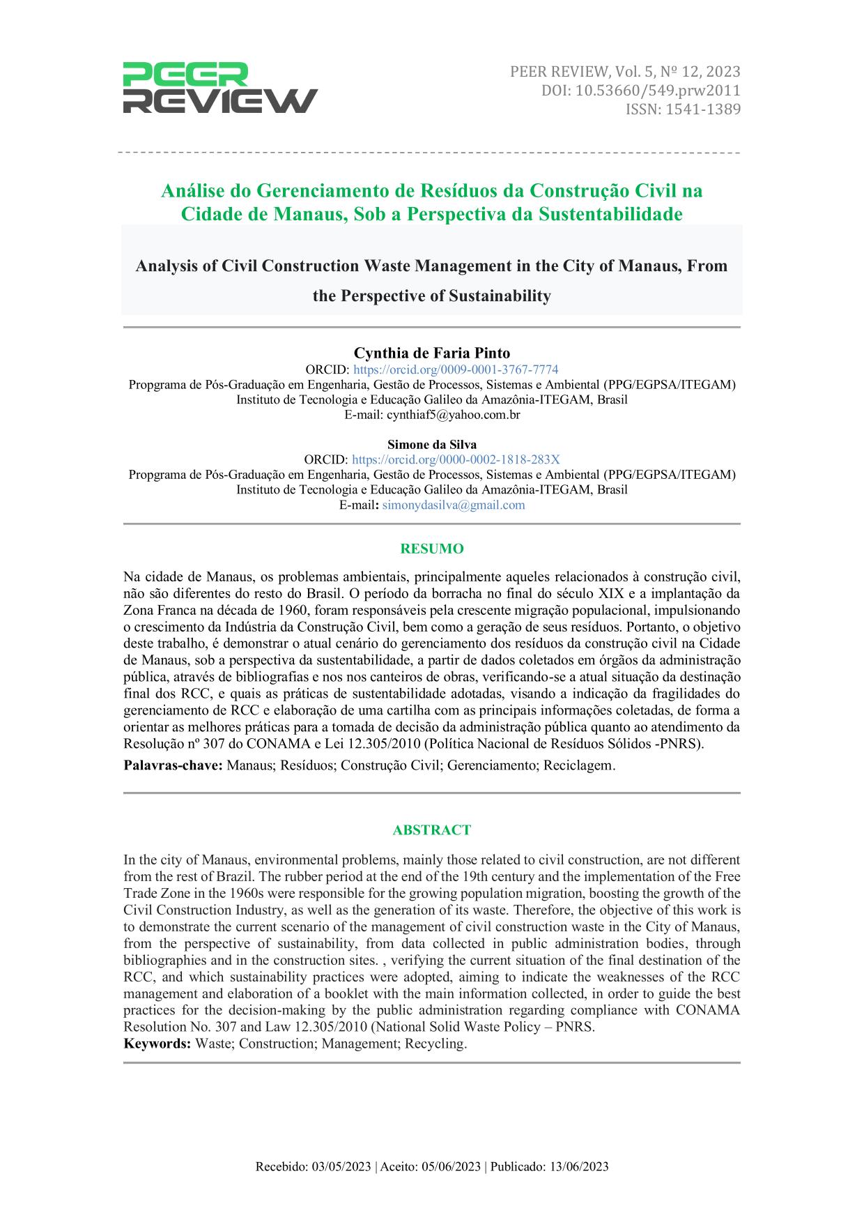 Analysis of Civil Construction Waste Management in the City of Manaus, From the Perspective of Sustainability Na cidade de Manaus, os problemas ambientais, principalmente aqueles relacionados à construção civil, não são diferentes do resto do Brasil. O período da borracha no final do século XIX e a implantação da Zona Franca na década de 1960, foram responsáveis pela crescente migração populacional, impulsionando o crescimento da Indústria da Construção Civil, bem como a geração de seus resíduos. Portanto, o objetivo deste trabalho, é demonstrar o atual cenário do gerenciamento dos resíduos da construção civil na Cidade de Manaus, sob a perspectiva da sustentabilidade, a partir de dados coletados em órgãos da administração pública, através de bibliografias e nos nos canteiros de obras, verificando-se a atual situação da destinação final dos RCC, e quais as práticas de sustentabilidade adotadas, visando a indicação da fragilidades do gerenciamento de RCC e elaboração de uma cartilha com as principais informações coletadas, de forma a orientar as melhores práticas para a tomada de decisão da administração pública quanto ao atendimento da Resolução nº 307 do CONAMA e Lei 12.305/2010 (Política Nacional de Resíduos Sólidos -PNRS).