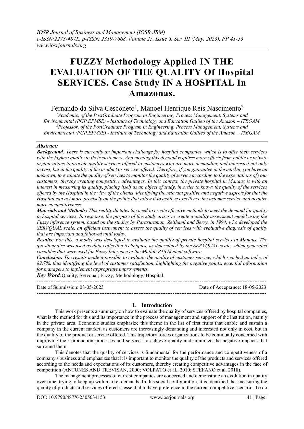 Results: For this, a model was developed to evaluate the quality of private hospital services in Manaus. The questionnaire was used as data collection techniques, as determined by the SERVQUAL scale, which generated variables that were used for Fuzzy Inference in the Matlab R16 Student software.