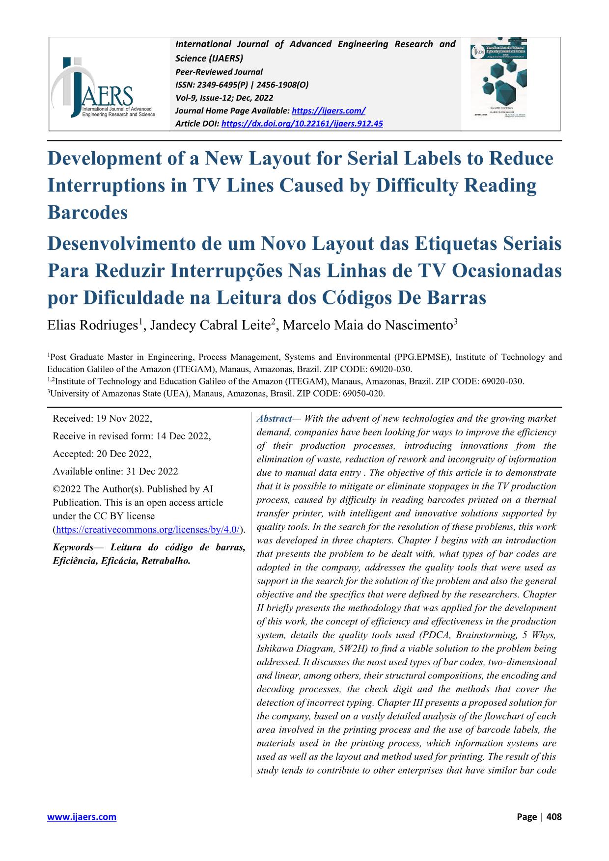 Development of a New Layout for Serial Labels to Reduce Interruptions in TV Lines Caused by Difficulty Reading Barcodes Com o advento de novas tecnologias e a crescente demanda do mercado, as empresas vêm buscando formas de melhorar a eficiência dos seus processos de produção introduzido inovações a partir da eliminação de desperdícios, redução de retrabalho e incongruência de informações devido entrada de dados manuais. O objetivo deste artigo é demonstrar que é possível mitigar ou eliminar paradas no processo de produção de Televisores, causados por dificuldade na leitura dos códigos de barras impressos em impressora de transferência térmica, com soluções inteligentes e inovadoras tendo como apoio as ferramentas da qualidade. Na busca da resolução desses problemas, este trabalho foi desenvolvido em três capítulos. O Capítulo I começa com uma introdução que apresenta a problemática a ser tratada, quais os tipos de códigos de barras adotado na empresa, aborda as ferramentas da qualidade que foram utilizadas como apoio na busca da solução do problema e ainda o objetivo geral e os específicos que foram definidos pelos pesquisadores. O Capítulo II apresenta de forma breve a metodologia que foi aplicada para o desenvolvimento deste trabalho, o conceito de eficiência e a eficácia no sistema de produção, detalha as ferramentas da qualidade utilizadas (PDCA, Brainstorming, 5 Porquês, Diagrama de Ishikawa, 5W2H) para encontrar uma solução viável para o problema a ser tratado. Aborda os tipos de códigos de barras mais utilizados, bidimensional e linear entre outros, suas composições estruturais, os processos de codificação e decodificação, o dígito verificador e os métodos que cobrem a detecção digitação incorreta. O Capítulo III apresenta uma proposta de solução para a empresa, tendo como base uma vasta detalhada análise do fluxograma de cada área envolvida no processo de impressão e utilização das etiquetas com código de barras, os materiais utilizados no processo de impressão, quais sistemas de informação são utilizados assim como o layout e o método utilizado para a impressão. O resultado desse estudo tende a contribuir com os demais empreendimentos que possuem processos similares de impressão de códigos de barras, uma vez que sua aplicação tem como objetivo reduzir ou eliminar paradas de linha, atuando diretamente nas falhas dos códigos de barras que tanto causam as paradas de linha, demonstrando que o pensamento disruptivo associado a uma mudança inteligente contribui positivamente para com o resultado da empresa melhorando o fluxo do processo e de informações, contribuindo com o aumento da eficiência e a redução de retrabalhos.
