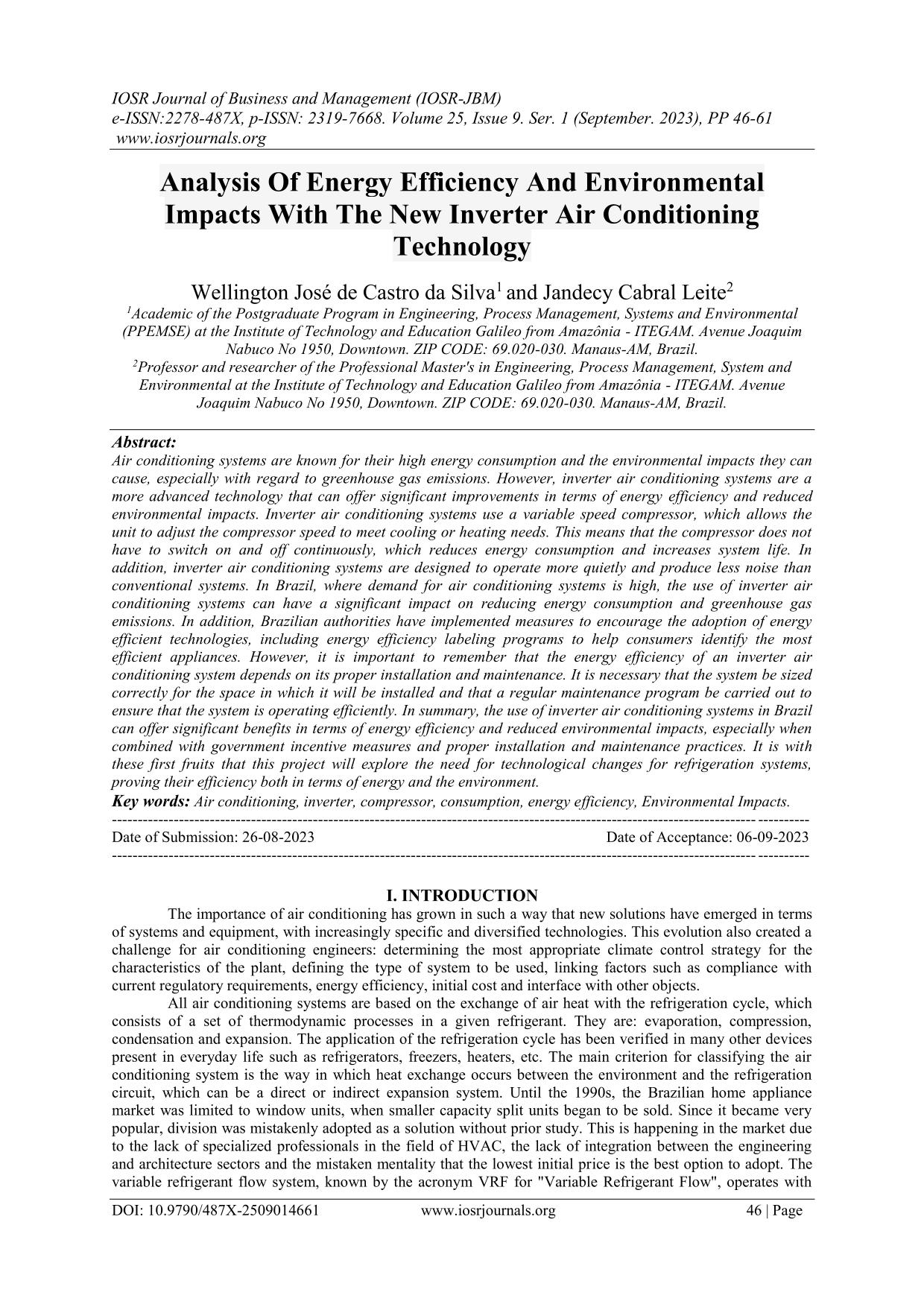 Analysis Of Energy Efficiency And Environmental Impacts With The New Inverter Air Conditioning Technology Air conditioning systems are known for their high energy consumption and the environmental impacts they can cause, especially with regard to greenhouse gas emissions. However, inverter air conditioning systems are a more advanced technology that can offer significant improvements in terms of energy efficiency and reduced environmental impacts. Inverter air conditioning systems use a variable speed compressor, which allows the unit to adjust the compressor speed to meet cooling or heating needs. This means that the compressor does not have to switch on and off continuously, which reduces energy consumption and increases system life. In addition, inverter air conditioning systems are designed to operate more quietly and produce less noise than conventional systems. In Brazil, where demand for air conditioning systems is high, the use of inverter air conditioning systems can have a significant impact on reducing energy consumption and greenhouse gas emissions. In addition, Brazilian authorities have implemented measures to encourage the adoption of energyefficient technologies, including energy efficiency labeling programs to help consumers identify the most efficient appliances. However, it is important to remember that the energy efficiency of an inverter air conditioning system depends on its proper installation and maintenance. It is necessary that the system be sized correctly for the space in which it will be installed and that a regular maintenance program be carried out to ensure that the system is operating efficiently. In summary, the use of inverter air conditioning systems in Brazil can offer significant benefits in terms of energy efficiency and reduced environmental impacts, especially when combined with government incentive measures and proper installation and maintenance practices. It is with these first fruits that this project will explore the need for technological changes for refrigeration systems, proving their efficiency both in terms of energy and the environment.
