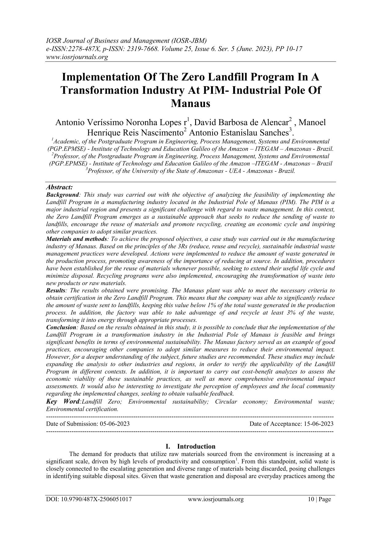 Implementation Of The Zero Landfill Program In A Transformation Industry At PIM- Industrial Pole Of Manaus Background: This study was carried out with the objective of analyzing the feasibility of implementing the Landfill Program in a manufacturing industry located in the Industrial Pole of Manaus (PIM). The PIM is a major industrial region and presents a significant challenge with regard to waste management. In this context, the Zero Landfill Program emerges as a sustainable approach that seeks to reduce the sending of waste to landfills, encourage the reuse of materials and promote recycling, creating an economic cycle and inspiring other companies to adopt similar practices.