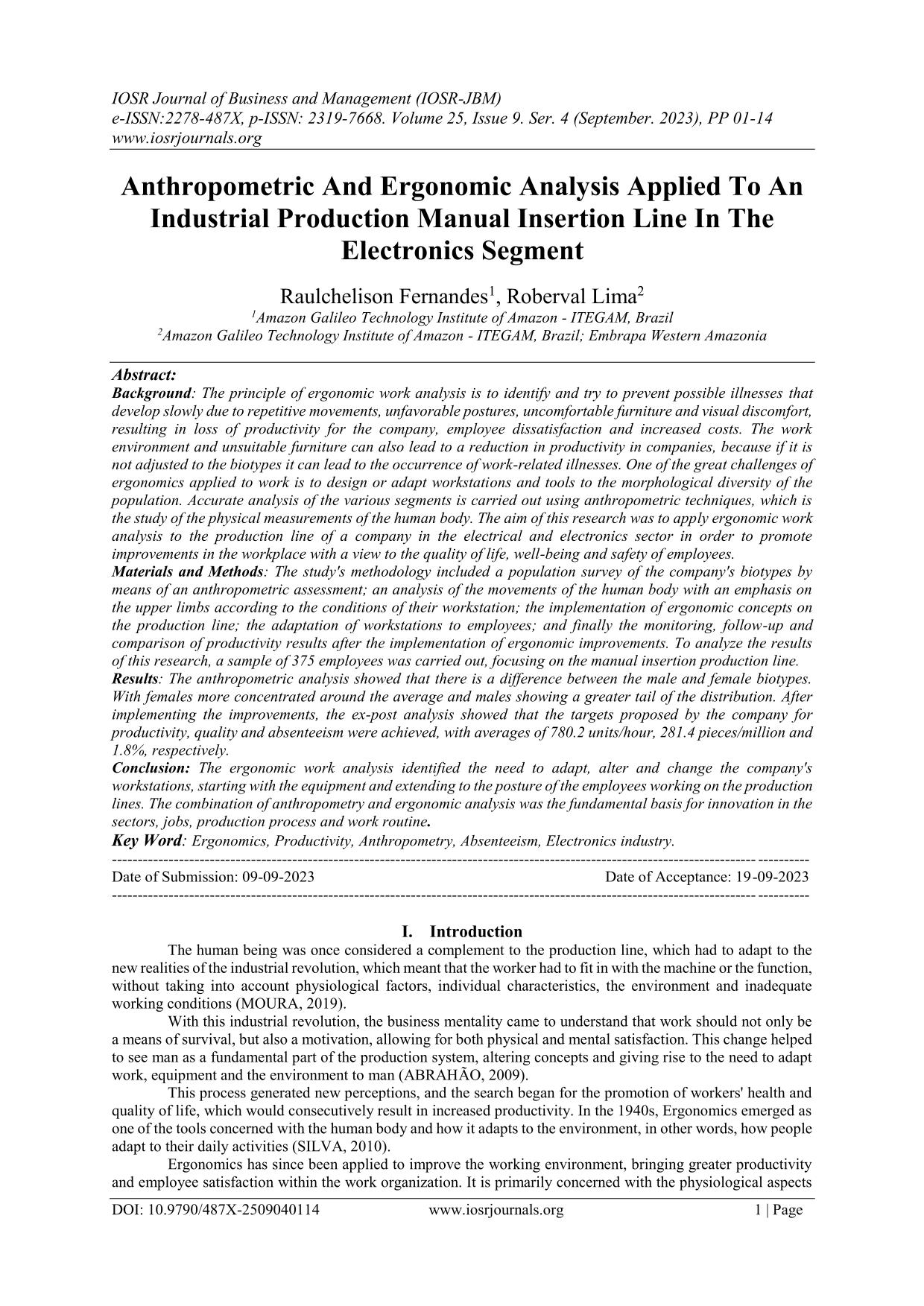 Production Manual Insertion Line In The Electronics Segment Background: The principle of ergonomic work analysis is to identify and try to prevent possible illnesses that develop slowly due to repetitive movements, unfavorable postures, uncomfortable furniture and visual discomfort, resulting in loss of productivity for the company, employee dissatisfaction and increased costs. The work environment and unsuitable furniture can also lead to a reduction in productivity in companies, because if it is not adjusted to the biotypes it can lead to the occurrence of work-related illnesses. One of the great challenges of ergonomics applied to work is to design or adapt workstations and tools to the morphological diversity of the population. Accurate analysis of the various segments is carried out using anthropometric techniques, which is the study of the physical measurements of the human body. The aim of this research was to apply ergonomic work analysis to the production line of a company in the electrical and electronics sector in order to promote improvements in the workplace with a view to the quality of life, well-being and safety of employees.