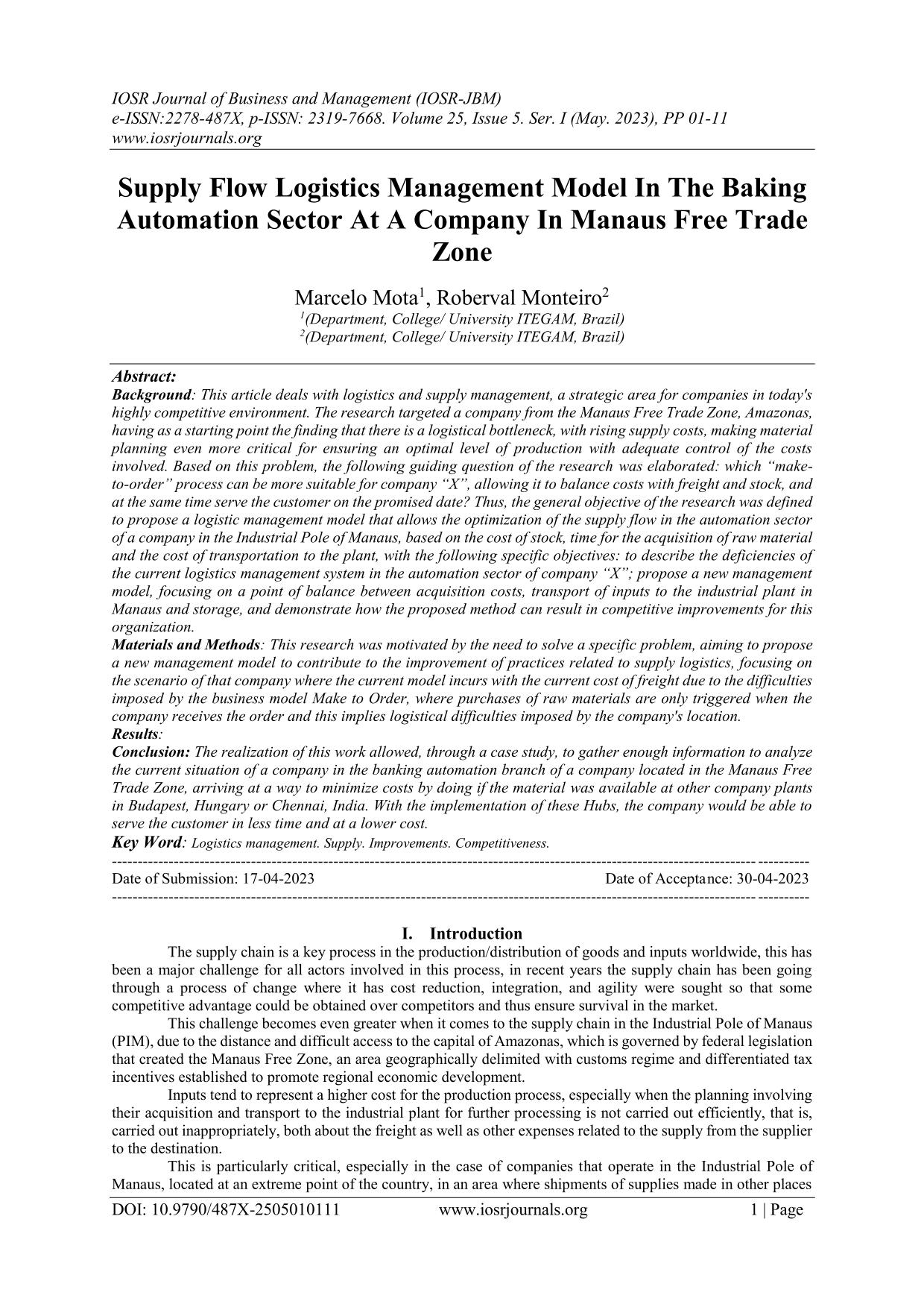 Supply Flow Logistics Management Model In The Baking Automation Sector At A Company In Manaus Free Trade Zone Background: This article deals with logistics and supply management, a strategic area for companies in today's highly competitive environment. The research targeted a company from the Manaus Free Trade Zone, Amazonas, having as a starting point the finding that there is a logistical bottleneck, with rising supply costs, making material planning even more critical for ensuring an optimal level of production with adequate control of the costs involved. Based on this problem, the following guiding question of the research was elaborated: which “make to-order” process can be more suitable for company “X”, allowing it to balance costs with freight and stock, and at the same time serve the customer on the promised date? Thus, the general objective of the research was defined to propose a logistic management model that allows the optimization of the supply flow in the automation sector of a company in the Industrial Pole of Manaus, based on the cost of stock, time for the acquisition of raw material and the cost of transportation to the plant, with the following specific objectives: to describe the deficiencies of the current logistics management system in the automation sector of company “X”; propose a new management model, focusing on a point of balance between acquisition costs, transport of inputs to the industrial plant in Manaus and storage, and demonstrate how the proposed method can result in competitive improvements for this organization.