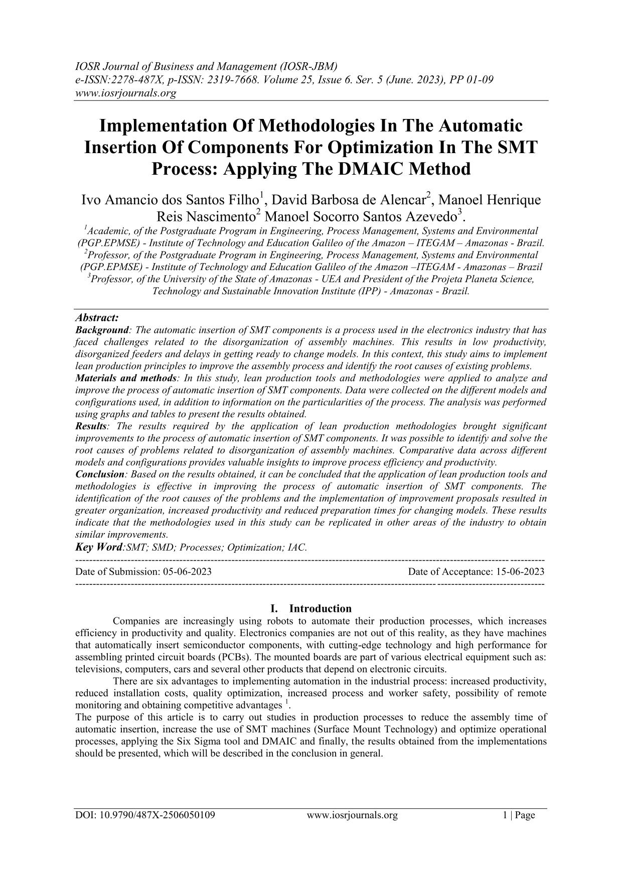 Conclusion: Based on the results obtained, it can be concluded that the application of lean production tools and methodologies is effective in improving the process of automatic insertion of SMT components. The identification of the root causes of the problems and the implementation of improvement proposals resulted in greater organization, increased productivity and reduced preparation times for changing models. These results indicate that the methodologies used in this study can be replicated in other areas of the industry to obtain similar improvements