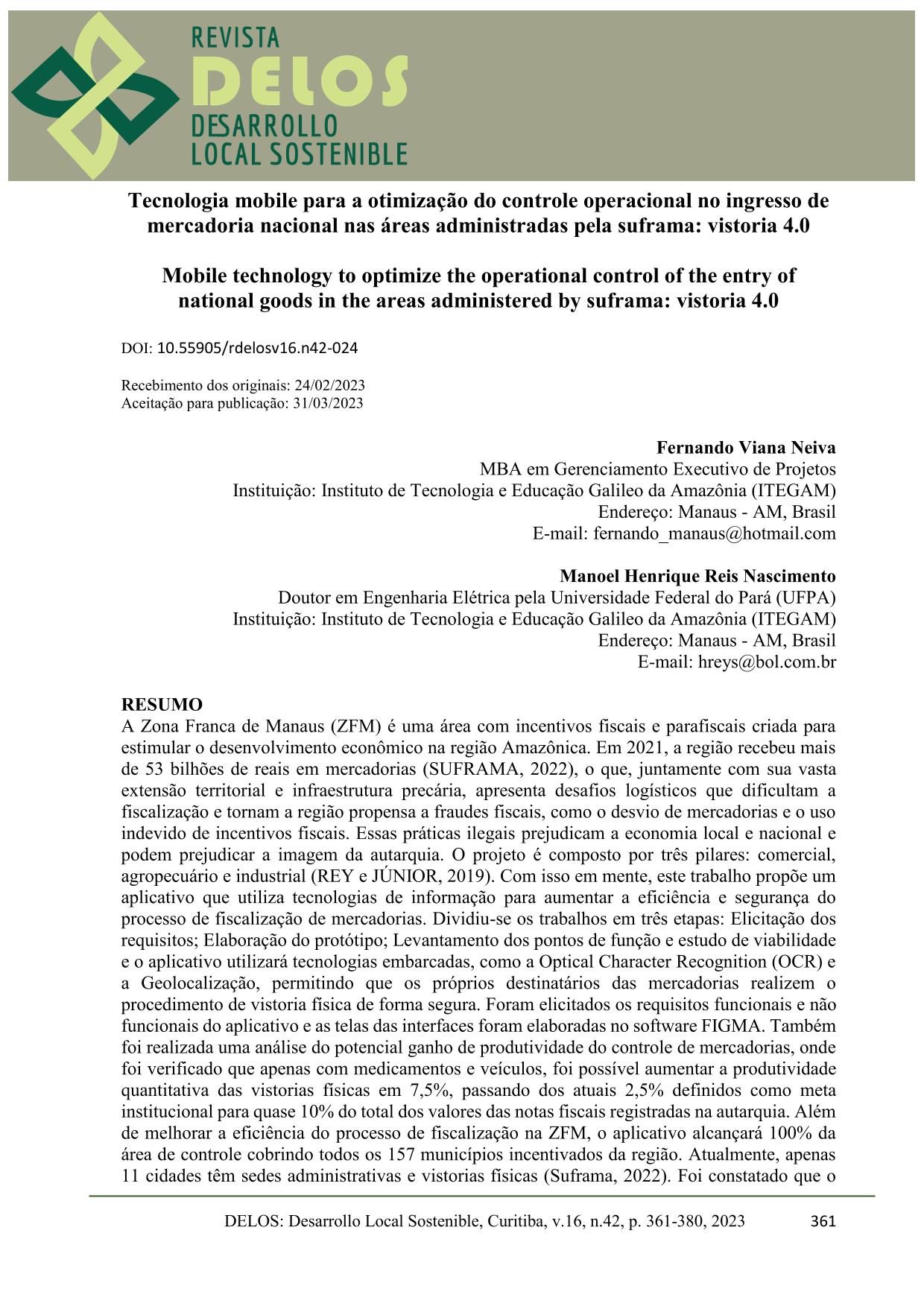 national goods in the areas administered by suframa: vistoria 4.0 A Zona Franca de Manaus (ZFM) é uma área com incentivos fiscais e parafiscais criada para estimular o desenvolvimento econômico na região Amazônica. Em 2021, a região recebeu mais de 53 bilhões de reais em mercadorias (SUFRAMA, 2022), o que, juntamente com sua vasta extensão territorial e infraestrutura precária, apresenta desafios logísticos que dificultam a fiscalização e tornam a região propensa a fraudes fiscais, como o desvio de mercadorias e o uso indevido de incentivos fiscais. Essas práticas ilegais prejudicam a economia local e nacional e podem prejudicar a imagem da autarquia. O projeto é composto por três pilares: comercial, agropecuário e industrial (REY e JÚNIOR, 2019). Com isso em mente, este trabalho propõe um aplicativo que utiliza tecnologias de informação para aumentar a eficiência e segurança do processo de fiscalização de mercadorias. Dividiu-se os trabalhos em três etapas: Elicitação dos requisitos; Elaboração do protótipo; Levantamento dos pontos de função e estudo de viabilidade e o aplicativo utilizará tecnologias embarcadas, como a Optical Character Recognition (OCR) e a Geolocalização, permitindo que os próprios destinatários das mercadorias realizem o procedimento de vistoria física de forma segura. Foram elicitados os requisitos funcionais e não funcionais do aplicativo e as telas das interfaces foram elaboradas no software FIGMA. Também foi realizada uma análise do potencial ganho de produtividade do controle de mercadorias, onde foi verificado que apenas com medicamentos e veículos, foi possível aumentar a produtividade quantitativa das vistorias físicas em 7,5%, passando dos atuais 2,5% definidos como meta institucional para quase 10% do total dos valores das notas fiscais registradas na autarquia. Além de melhorar a eficiência do processo de fiscalização na ZFM, o aplicativo alcançará 100% da área de controle cobrindo todos os 157 municípios incentivados da região. Atualmente, apenas 11 cidades têm sedes administrativas e vistorias físicas (Suframa, 2022). Foi constatado que o baixo investimento necessário para o desenvolvimento do aplicativo, em comparação com a contratação de servidores para realizar o mesmo número de vistorias físicas, é vantajoso pela sua economicidade. A utilização de tecnologias da informação para fortalecer o controle de entrada de mercadorias é uma opção econômica, prática e sustentável que pode fortalecer o processo de fiscalização e minimizar os riscos de fraude.