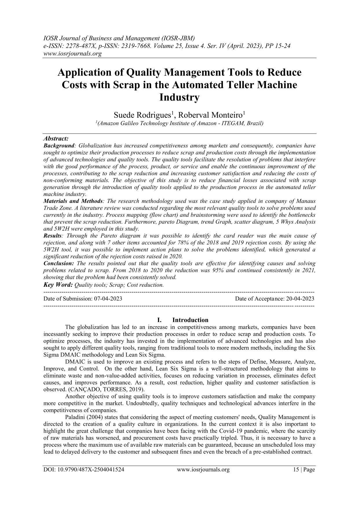 Industry Background: Globalization has increased competitiveness among markets and consequently, companies have sought to optimize their production processes to reduce scrap and production costs through the implementation of advanced technologies and quality tools. The quality tools facilitate the resolution of problems that interfere with the good performance of the process, product, or service and enable the continuous improvement of the processes, contributing to the scrap reduction and increasing customer satisfaction and reducing the costs of non-conforming materials. The objective of this study is to reduce financial losses associated with scrap generation through the introduction of quality tools applied to the production process in the automated teller machine industry.