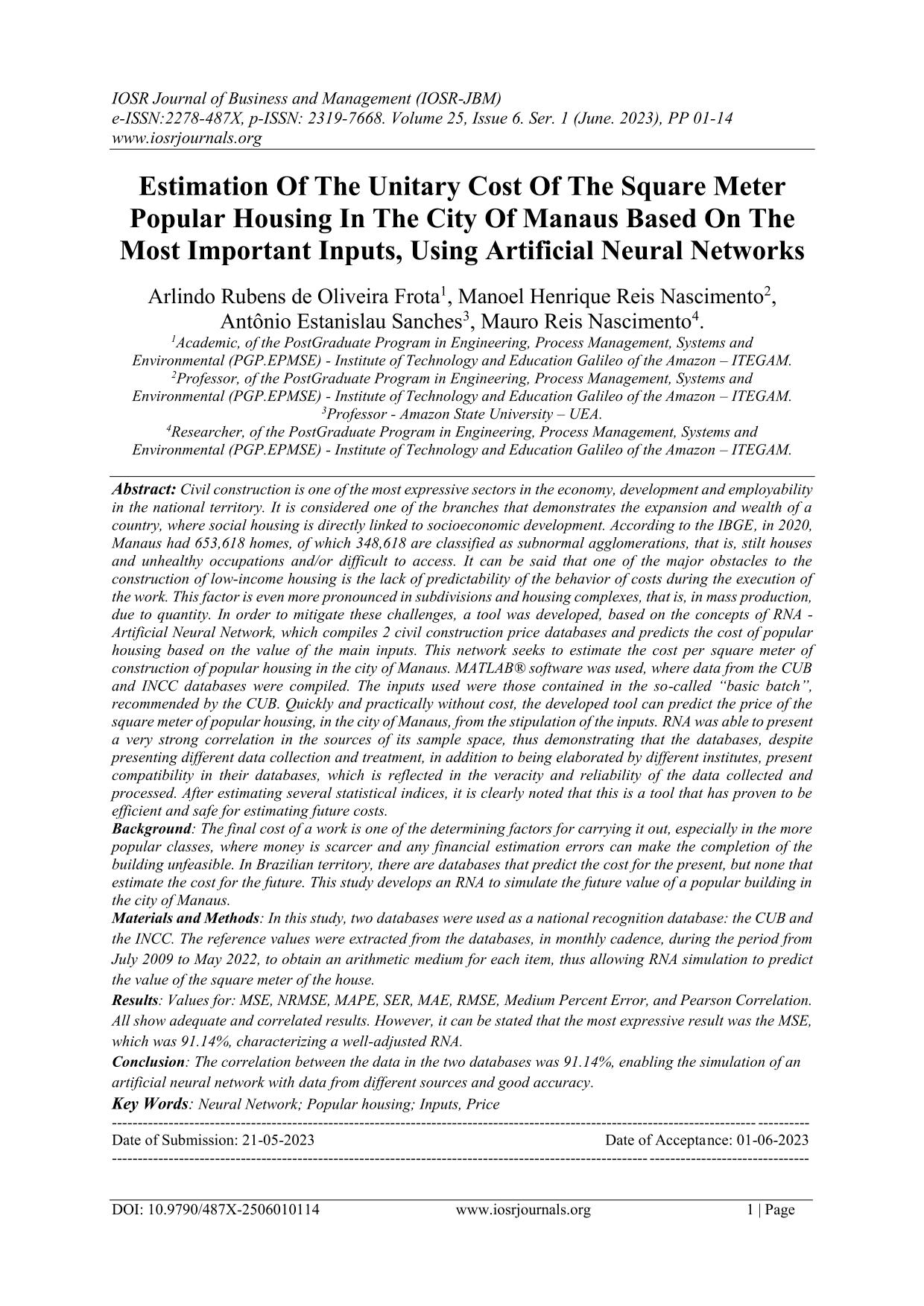 Estimation Of The Unitary Cost Of The Square Meter Popular Housing In The City Of Manaus Based On The Most Important Inputs, Using Artificial Neural Networks Abstract: Civil construction is one of the most expressive sectors in the economy, development and employability in the national territory. It is considered one of the branches that demonstrates the expansion and wealth of a country, where social housing is directly linked to socioeconomic development. According to the IBGE, in 2020, Manaus had 653,618 homes, of which 348,618 are classified as subnormal agglomerations, that is, stilt houses and unhealthy occupations and/or difficult to access. It can be said that one of the major obstacles to the construction of low-income housing is the lack of predictability of the behavior of costs during the execution of the work. This factor is even more pronounced in subdivisions and housing complexes, that is, in mass production, due to quantity. In order to mitigate these challenges, a tool was developed, based on the concepts of RNA -Artificial Neural Network, which compiles 2 civil construction price databases and predicts the cost of popular housing based on the value of the main inputs. This network seeks to estimate the cost per square meter of construction of popular housing in the city of Manaus. MATLAB® software was used, where data from the CUB and INCC databases were compiled. The inputs used were those contained in the so-called “basic batch”, recommended by the CUB. Quickly and practically without cost, the developed tool can predict the price of the square meter of popular housing, in the city of Manaus, from the stipulation of the inputs. RNA was able to present a very strong correlation in the sources of its sample space, thus demonstrating that the databases, despite presenting different data collection and treatment, in addition to being elaborated by different institutes, present compatibility in their databases, which is reflected in the veracity and reliability of the data collected and processed. After estimating several statistical indices, it is clearly noted that this is a tool that has proven to be efficient and safe for estimating future costs.