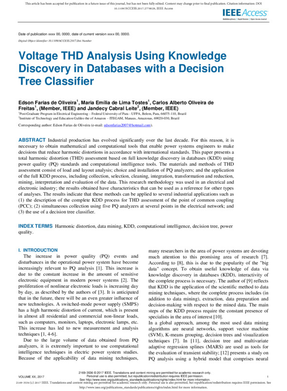 INDEX TERMS Harmonic distortion, data mining, KDD, computational intelligence, decision tree, power quality.