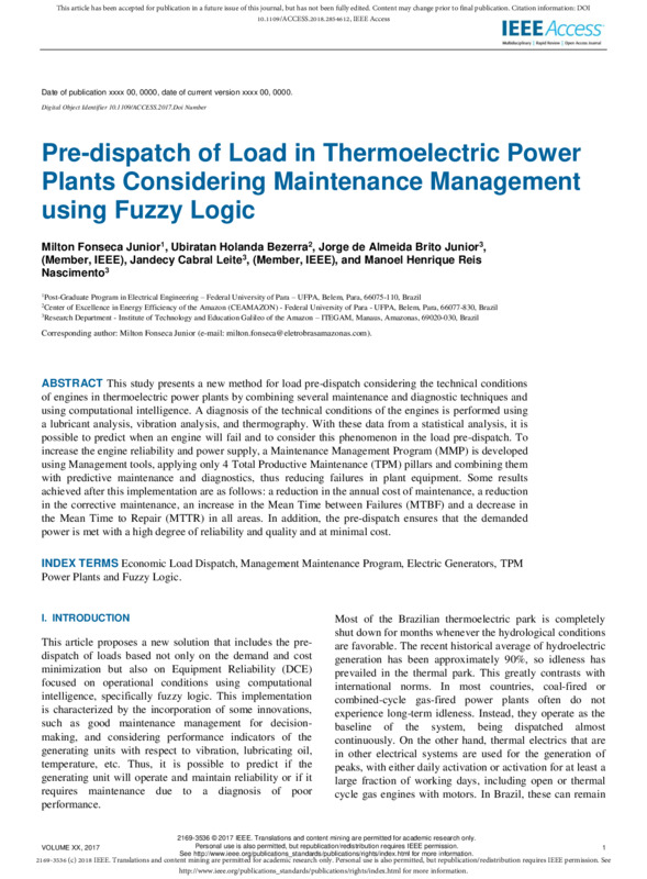 Pre-dispatch of Load in Thermoelectric Power Plants Considering Maintenance Management using Fuzzy Logic